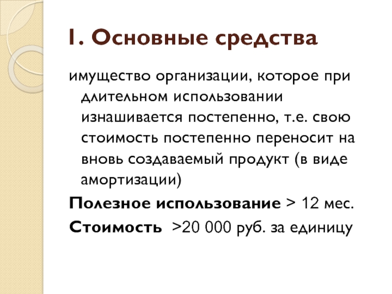 1. Основные средстваимущество организации, которое при длительном использовании изнашивается постепенно, т.е. свою стоимость постепенно переносит на вновь