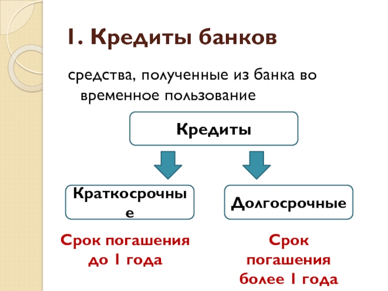 1. Кредиты банковсредства, полученные из банка во временное пользованиеКредитыКраткосрочныеДолгосрочныеСрок погашения до 1 годаСрок погашения более 1 года