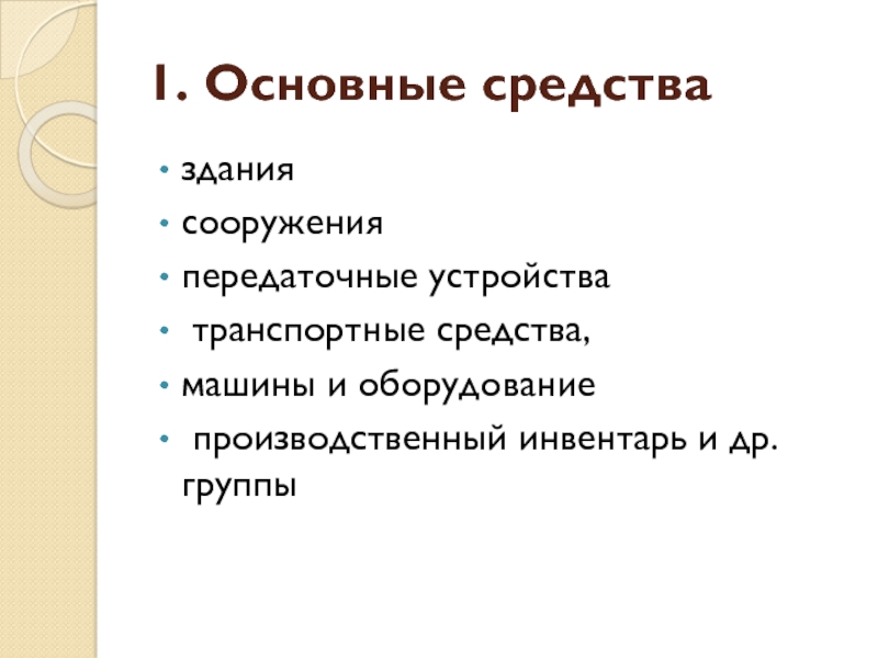 1. Основные средствазданиясооруженияпередаточные устройства транспортные средства,машины и оборудование производственный инвентарь и др. группы