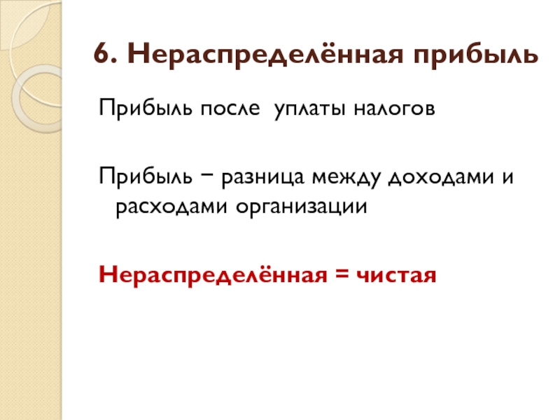 6. Нераспределённая прибыльПрибыль после уплаты налоговПрибыль  разница между доходами и расходами организацииНераспределённая = чистая