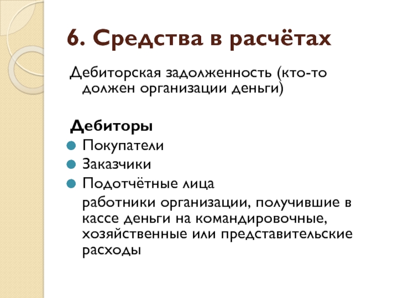 6. Средства в расчётахДебиторская задолженность (кто-то должен организации деньги)ДебиторыПокупателиЗаказчикиПодотчётные лицаработники организации, получившие в кассе деньги на командировочные,