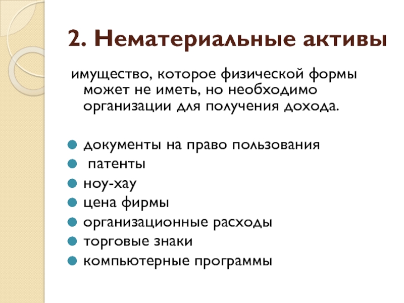 2. Нематериальные активыимущество, которое физической формы может не иметь, но необходимо организации для получения дохода. документы на