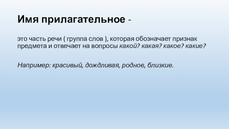 какое? какие?Например: красивый, дождливая, родное, близкие.