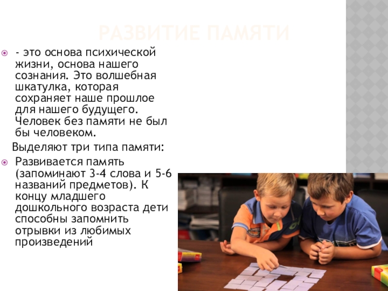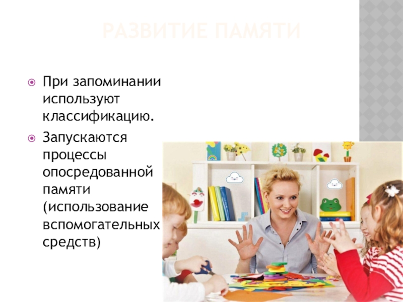 Развивается память (запоминают 3-4 слова и 5-6 названий предметов). К концу младшего дошкольного возраста дети способны запомнить отрывки из любимых произведений