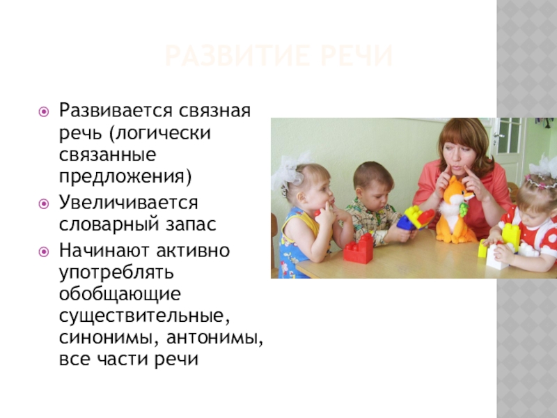 Начинают активно употреблять обобщающие существительные, синонимы, антонимы, все части речи