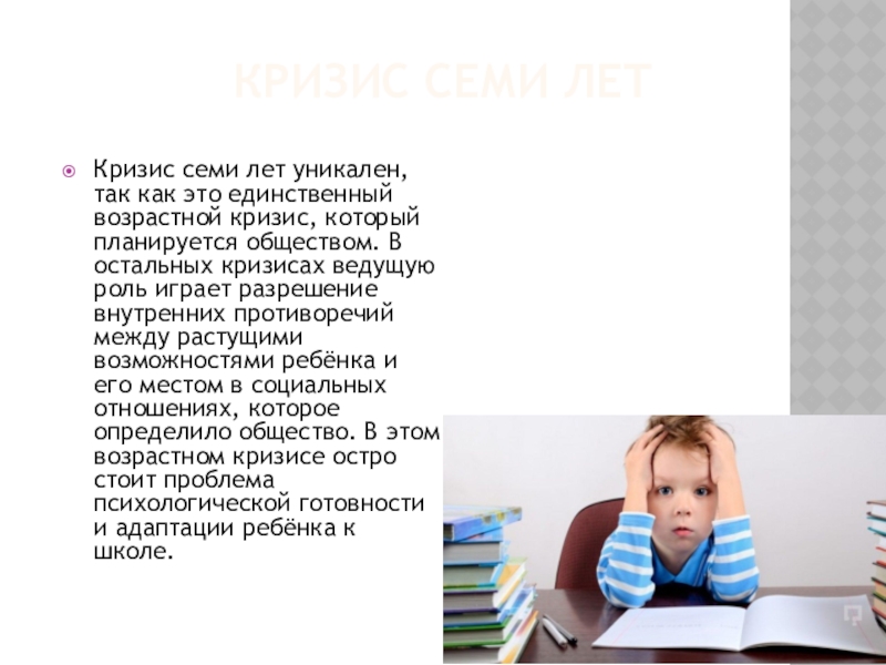 играет разрешение внутренних противоречий между растущими возможностями ребёнка и его местом в социальных отношениях, которое определило общество. В этом возрастном кризисе остро стоит проблема психологической готовности и адаптации ребёнка к школе.