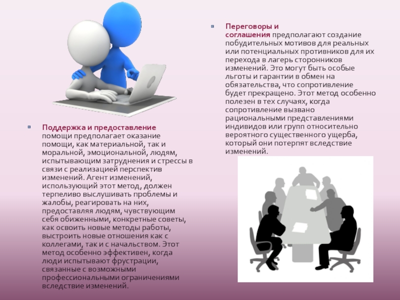 реализацией перспектив изменений. Агент изменений, использующий этот метод, должен терпеливо выслушивать проблемы и жалобы, реагировать на них, предоставляя людям, чувствующим себя обиженными, конкретные советы, как освоить новые методы работы, выстроить новые отношения как с коллегами, так и с начальством. Этот метод особенно эффективен, когда люди испытывают фрустрации, связанные с возможными профессиональными ограничениями вследствие изменений.