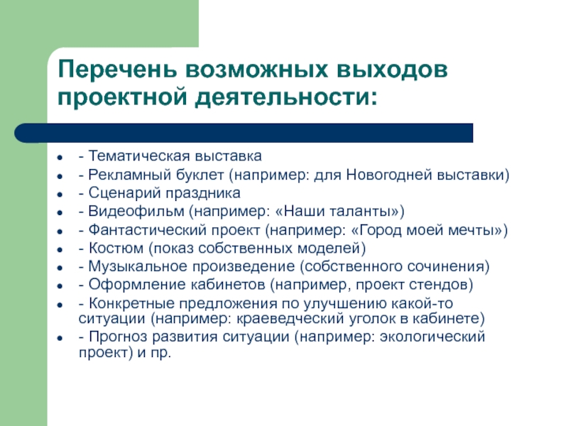 Слайд 15Перечень возможных выходов проектной деятельности: