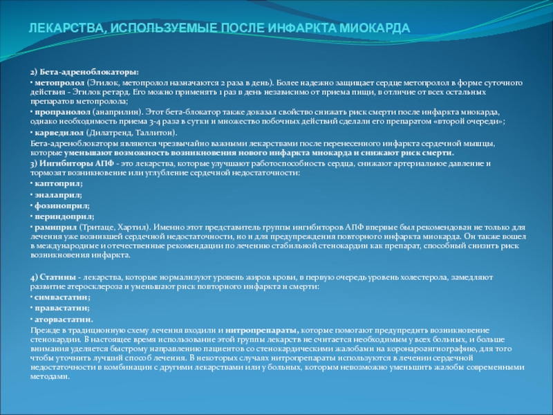 ЛЕКАРСТВА, ИСПОЛЬЗУЕМЫЕ ПОСЛЕ ИНФАРКТА МИОКАРДА