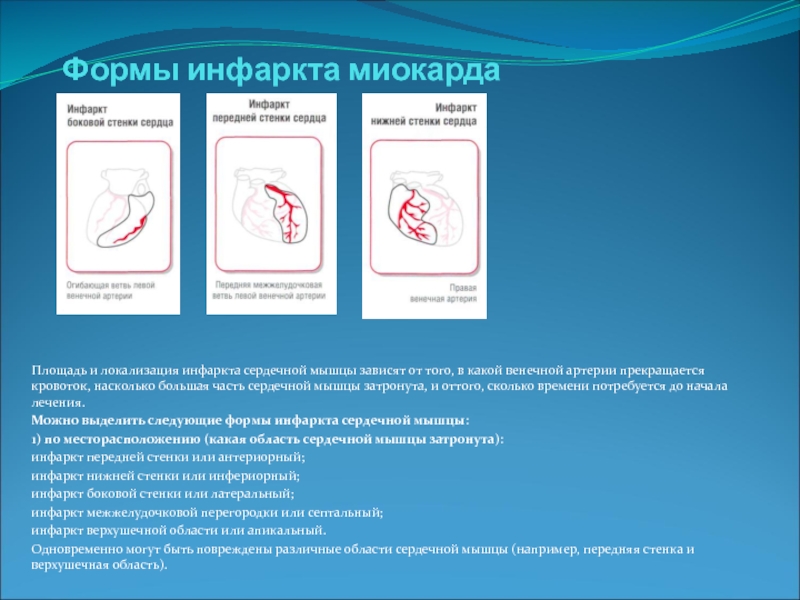 1) по месторасположению (какая область сердечной мышцы затронута):