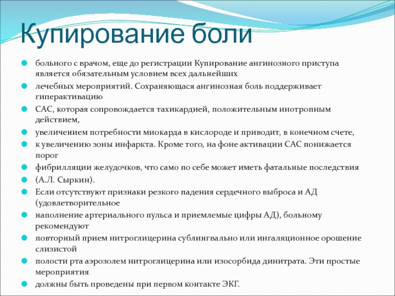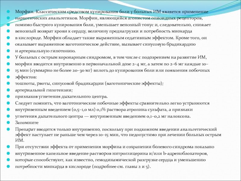 крови кислородом(SаO2) выше 90%, что приводит к увеличению его диффузии в область ишемизированного миокарда из близлежащих интактных участков сердечной мышцы, способствуя уменьшению размеров зоны ишемического повреждения (периинфарктной зоны). Оксигенотерапия показана больным ИМ по меньшей мере на протяжении первых 1–2 суток после госпитализации в блок интенсивной терапии. В последующем кислород используется в основном у пациентов с осложненным течением ИМ (см. ниже), например при наличии признаков застойной сердечной недостаточности, при кардиогенном шоке,рецидивирующих приступах ангинозных болей и т.п.