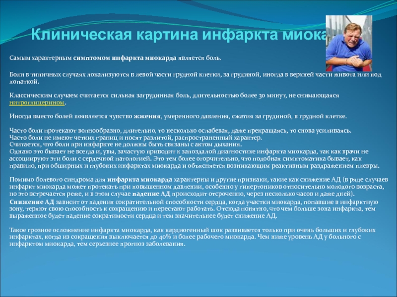 Классическим случаем считается сильная загрудинная боль, длительностью более 30 минут, не снимающаяся нитроглицерином.