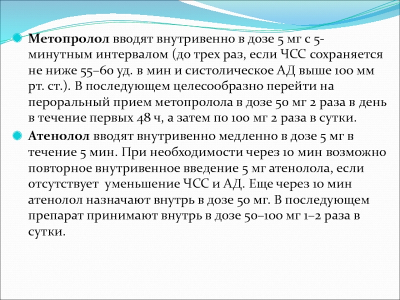 в мин и систолическое АД выше 100 мм рт. ст.). В последующем целесообразно перейти на пероральный прием метопролола в дозе 50 мг 2 раза в день в течение первых 48 ч, а затем по 100 мг 2 раза в сутки.