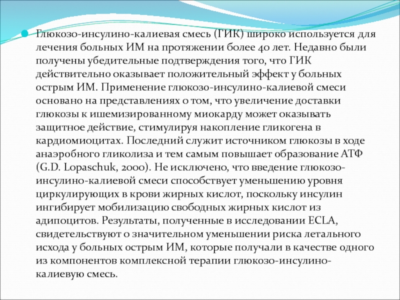 Слайд 30Глюкозо-инсулино-калиевая смесь (ГИК) широко используется для лечения больных ИМ на