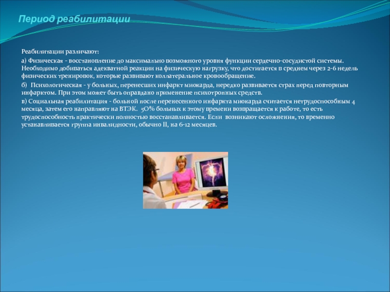 в) Социальная реабилитация - больной после перенесенного инфаркта миокарда считается нетрудоспособным 4 месяца, затем его направляют на ВТЭК. 5О% больных к этому времени возвращается к работе, то есть трудоспособность практически полностью восстанавливается. Если возникают осложнения, то временно устанавливается группа инвалидности, обычно II, на 6-12 месяцев.