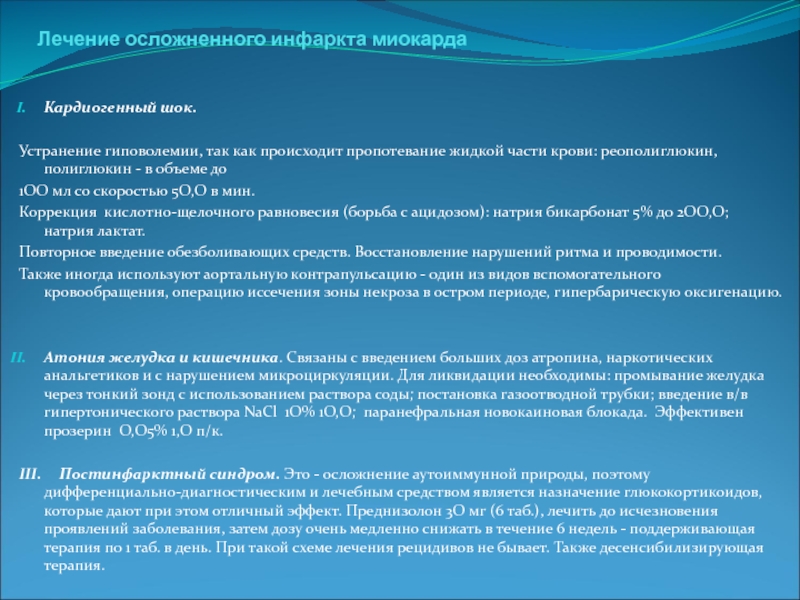 III. Постинфарктный синдром. Это - осложнение аутоиммунной природы, поэтому дифференциально-диагностическим и лечебным средством является назначение глюкокортикоидов, которые дают при этом отличный эффект. Преднизолон 3О мг (6 таб.), лечить до исчезновения проявлений заболевания, затем дозу очень медленно снижать в течение 6 недель - поддерживающая терапия по 1 таб. в день. При такой схеме лечения рецидивов не бывает. Также десенсибилизирующая терапия.