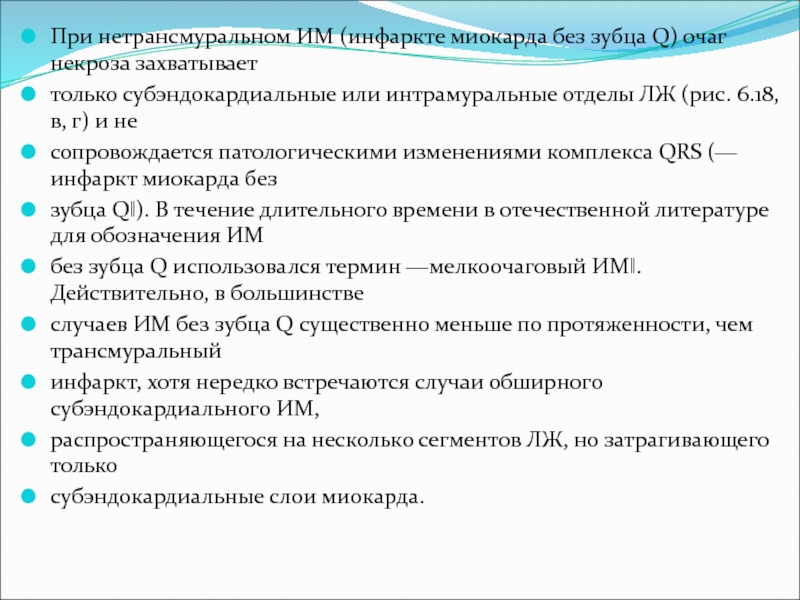 Слайд 6При нетрансмуральном ИМ (инфаркте миокарда без зубца Q) очаг некроза