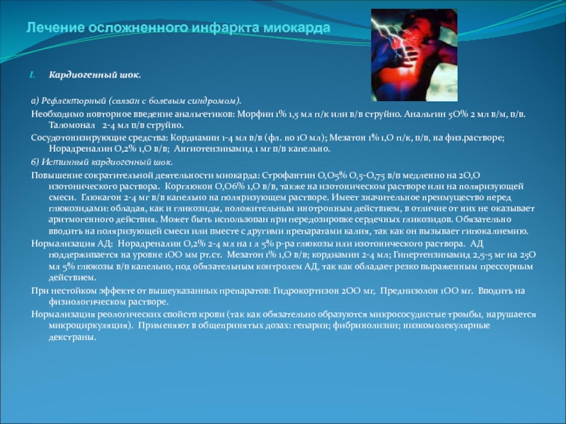 Повышение сократительной деятельности миокарда: Строфантин О,О5% О,5-О,75 в/в медленно на 2О,О изотонического раствора. Корглюкон О,О6% 1,О в/в, также на изотоническом растворе или на поляризующей смеси. Глюкагон 2-4 мг в/в капельно на поляризующем растворе. Имеет значительное преимущество перед глюкозидами: обладая, как и гликозиды, положительным инотропным действием, в отличие от них не оказывает аритмогенного действия. Может быть использован при передозировке сердечных гликозидов. Обязательно вводить на поляризующей смеси или вместе с другими препаратами калия, так как он вызывает гипокалиемию.