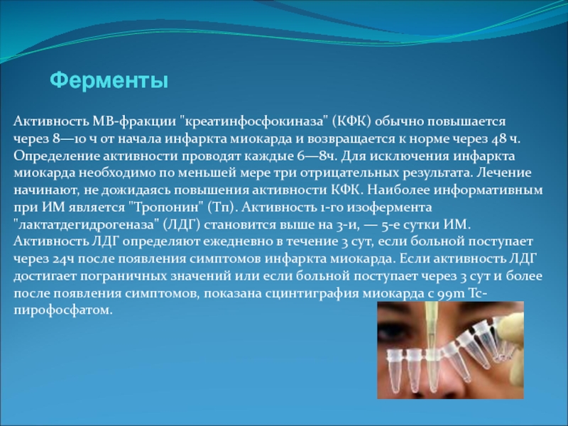 48 ч. Определение активности проводят каждые 6—8ч. Для исключения инфаркта миокарда необходимо по меньшей мере три отрицательных результата. Лечение начинают, не дожидаясь повышения активности КФК. Наиболее информативным при ИМ является "Тропонин" (Тп). Активность 1-го изофермента "лактатдегидрогеназа" (ЛДГ) становится выше на 3-и, — 5-е сутки ИМ. Активность ЛДГ определяют ежедневно в течение 3 сут, если больной поступает через 24ч после появления симптомов инфаркта миокарда. Если активность ЛДГ достигает пограничных значений или если больной поступает через 3 сут и более после появления симптомов, показана сцинтиграфия миокарда с 99m Tc-пирофосфатом.