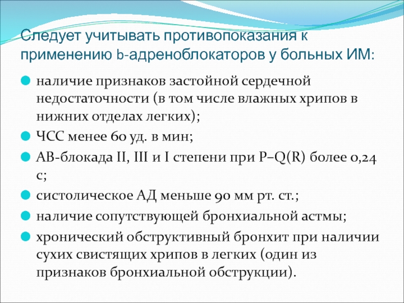 Слайд 25Следует учитывать противопоказания к применению b-адреноблокаторов у больных ИМ:
