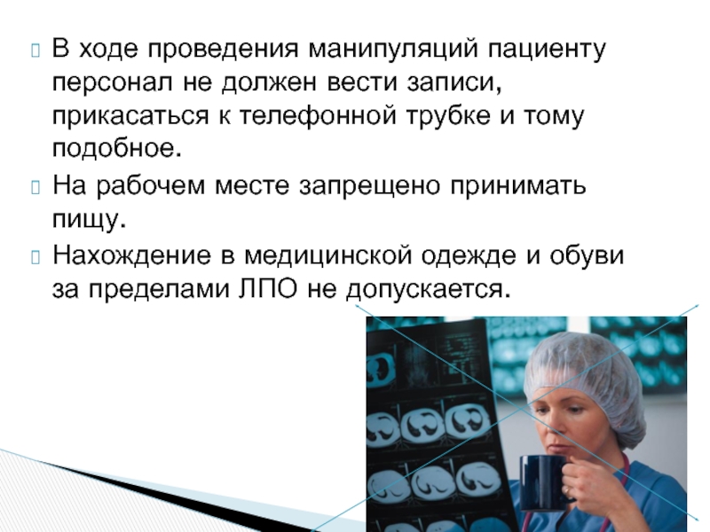 Слайд 49В ходе проведения манипуляций пациенту персонал не должен вести записи,