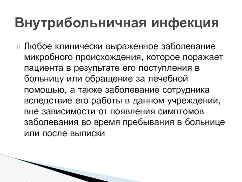 Слайд 2Любое клинически выраженное заболевание микробного происхождения, которое поражает пациента в