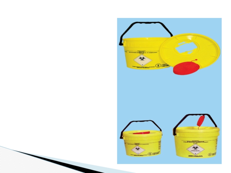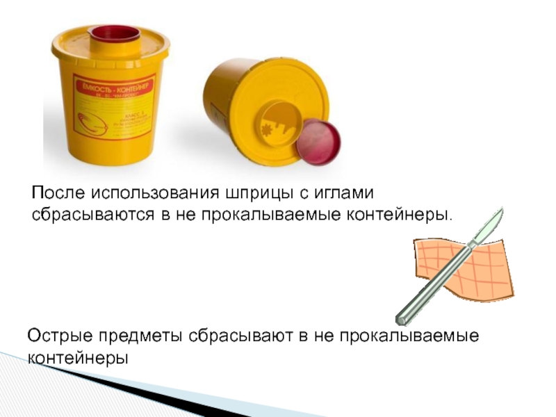 Слайд 24После использования шприцы с иглами сбрасываются в не прокалываемые контейнеры.