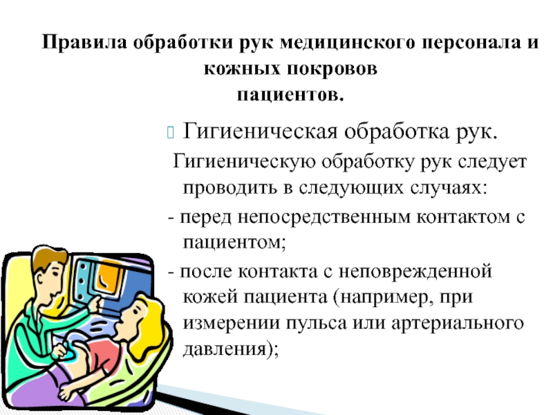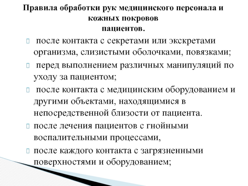 кожи рук выделениями, кровью и т.п. необходимо вымыть руки мылом и водой; тщательно высушить руки одноразовым полотенцем; дважды обработать антисептиком.