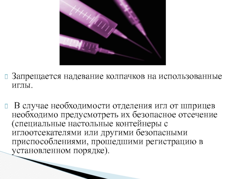 Слайд 23Запрещается надевание колпачков на использованные иглы.
