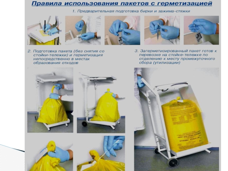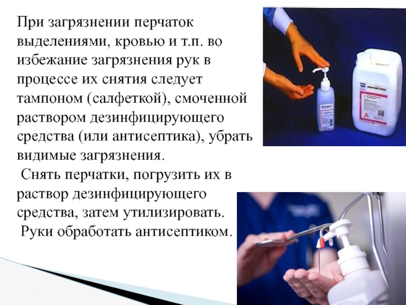 Слайд 45При загрязнении перчаток выделениями, кровью и т.п. во избежание загрязнения