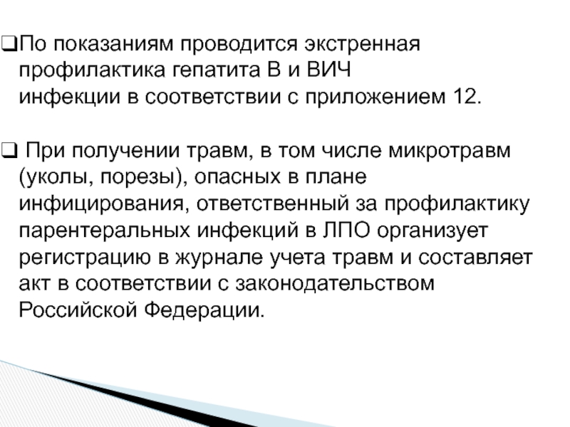 Слайд 22По показаниям проводится экстренная профилактика гепатита В и ВИЧ