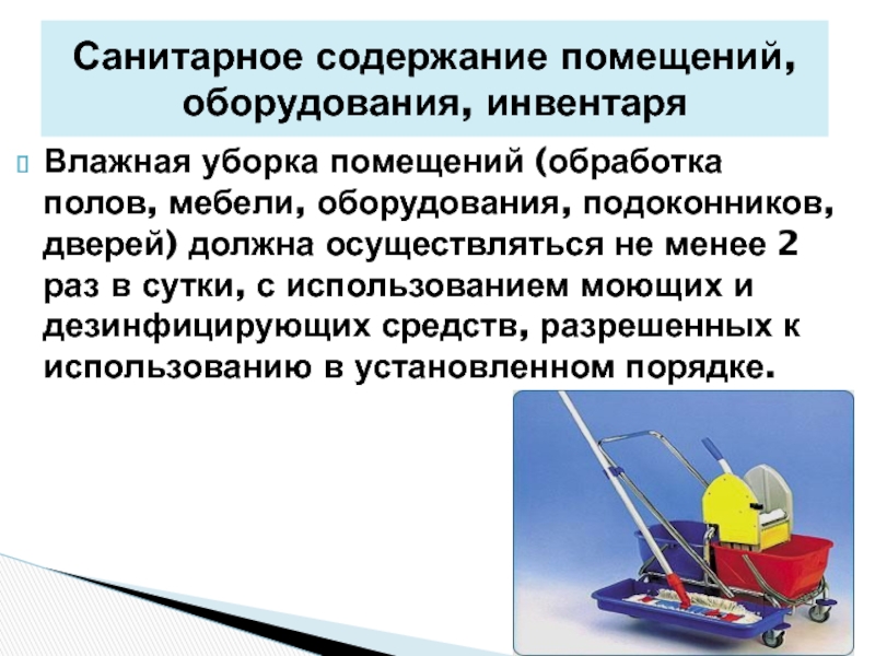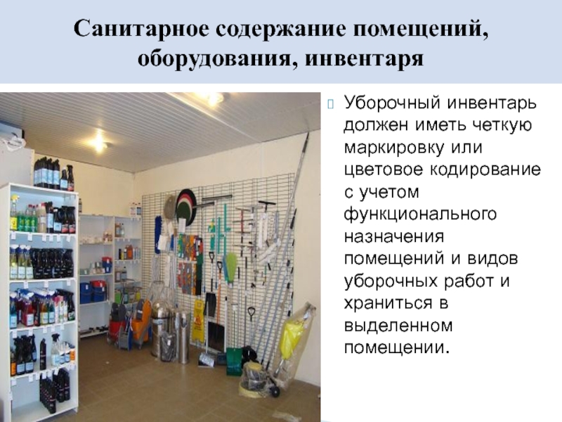 Слайд 26Санитарное содержание помещений, оборудования, инвентаря
