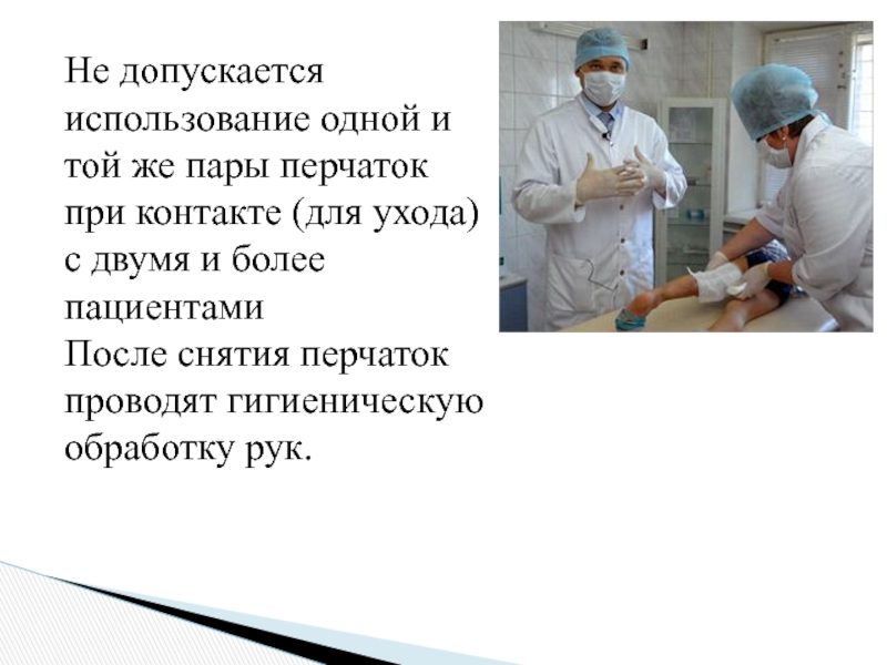 Слайд 44Не допускается использование одной и той же пары перчаток при