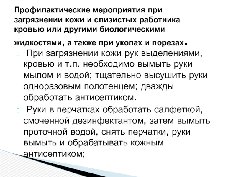 Слайд 19Профилактические мероприятия при загрязнении кожи и слизистых работника