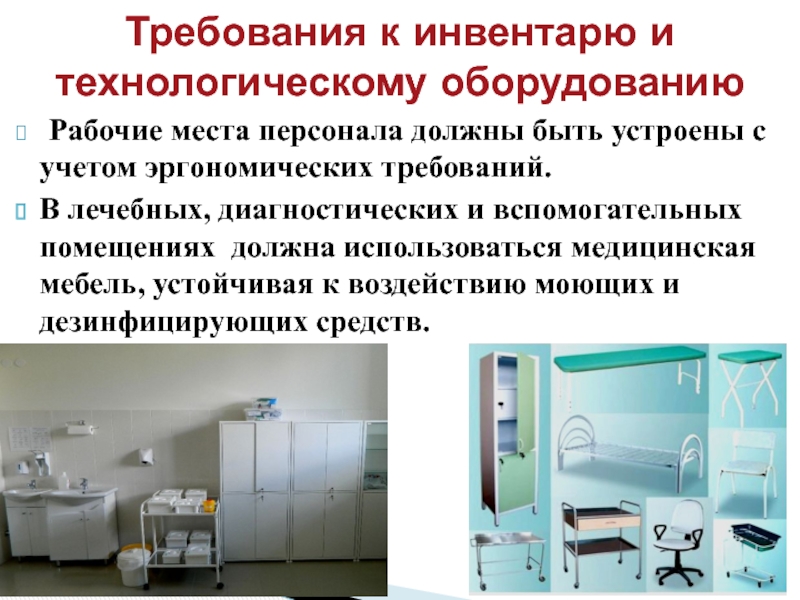 помещениях должна использоваться медицинская мебель, устойчивая к воздействию моющих и дезинфицирующих средств.
