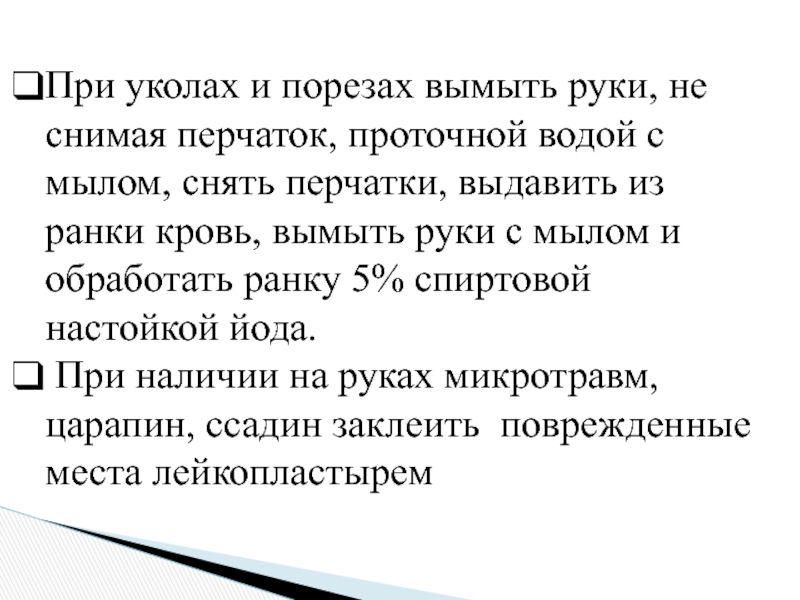 Слайд 21При уколах и порезах вымыть руки, не снимая перчаток, проточной