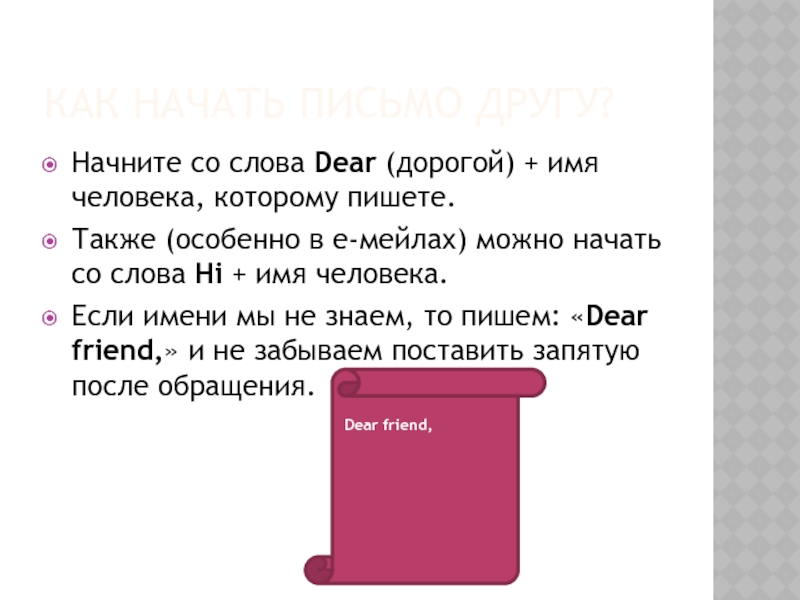 человека. Если имени мы не знаем, то пишем: «Dear friend,» и не забываем поставить запятую после обращения.