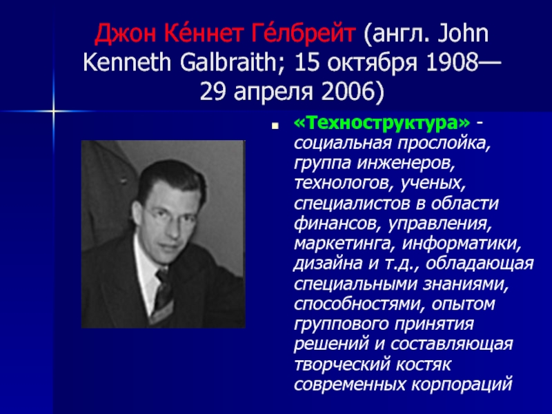 Слайд 16Джон Ке́ннет Ге́лбрейт (англ. John Kenneth Galbraith; 15 октября 1908—