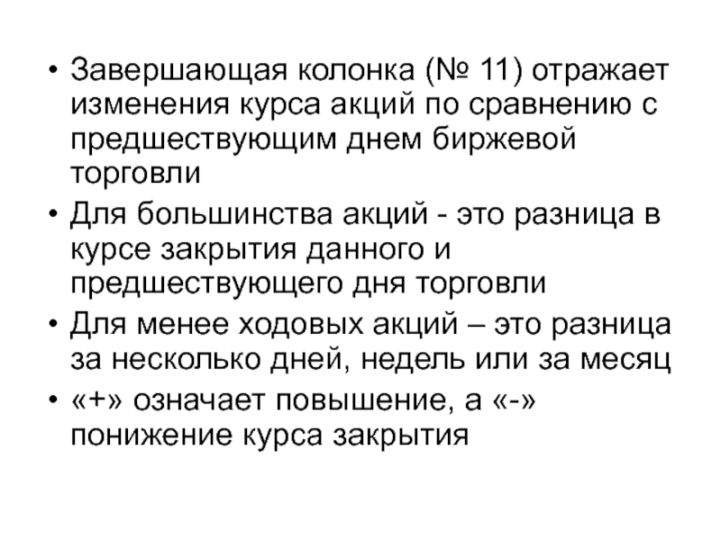 Слайд 15Завершающая колонка (№ 11) отражает изменения курса акций по сравнению