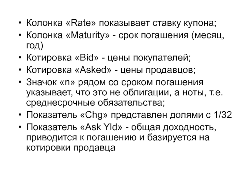 Слайд 20Колонка «Rate» показывает ставку купона;