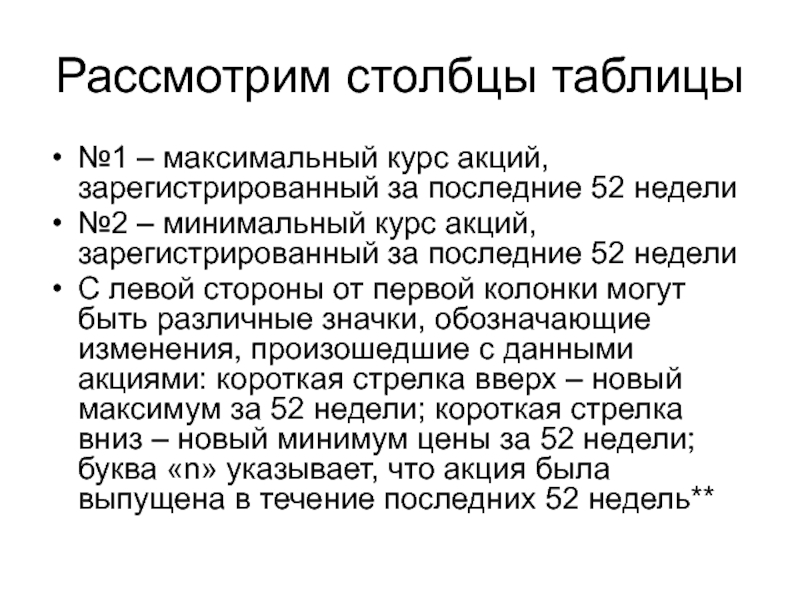 С левой стороны от первой колонки могут быть различные значки, обозначающие изменения, произошедшие с данными акциями: короткая стрелка вверх – новый максимум за 52 недели; короткая стрелка вниз – новый минимум цены за 52 недели; буква «n» указывает, что акция была выпущена в течение последних 52 недель**