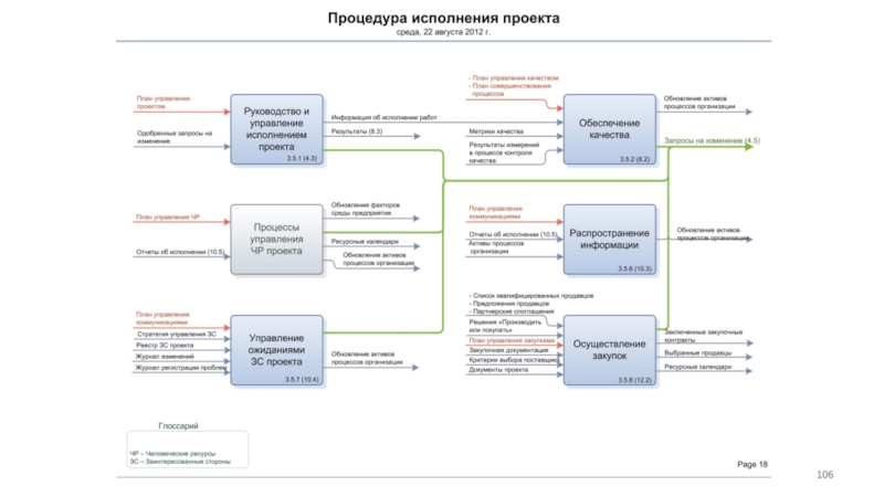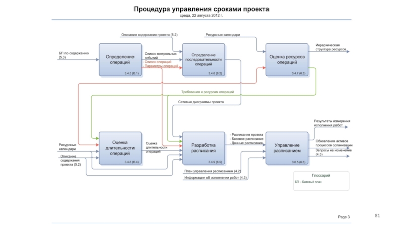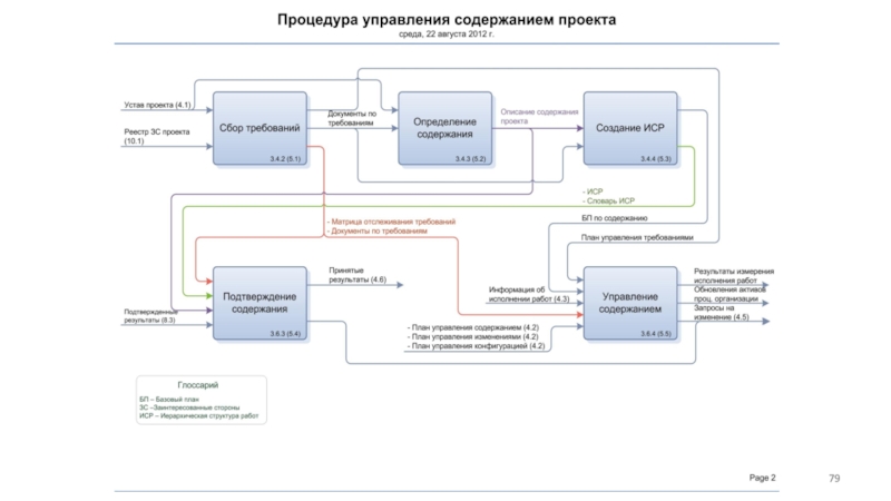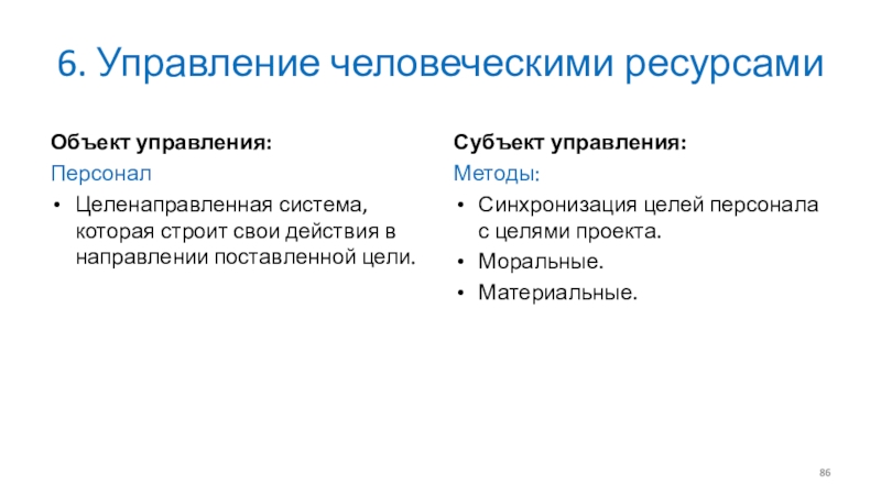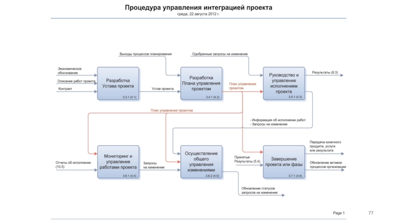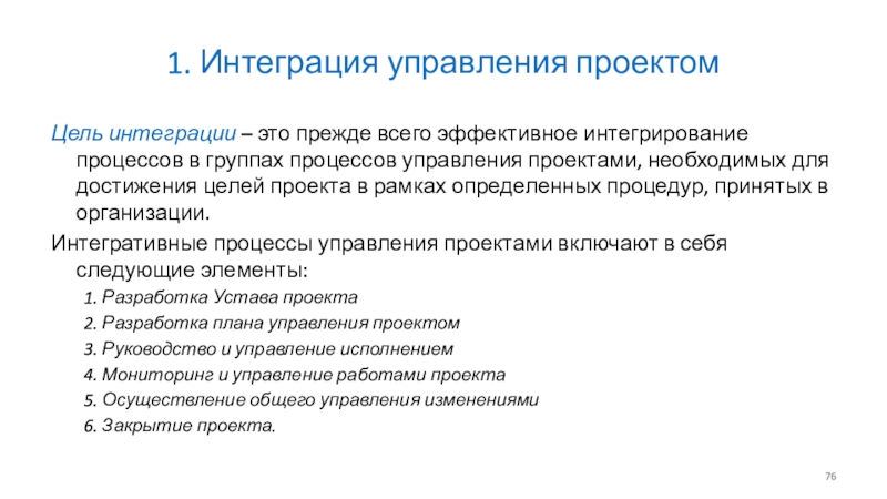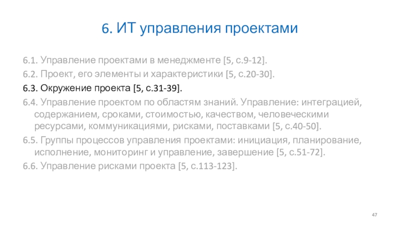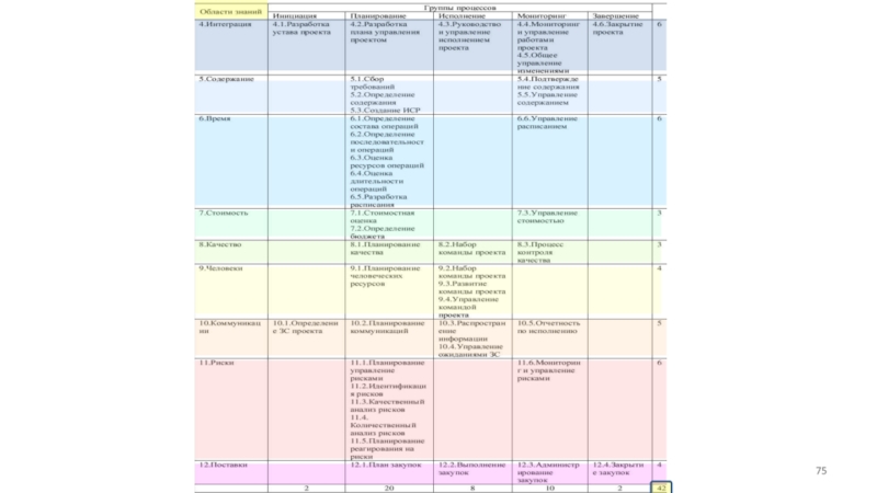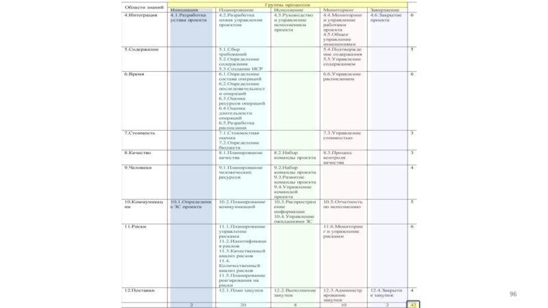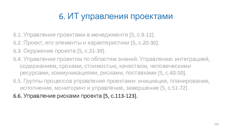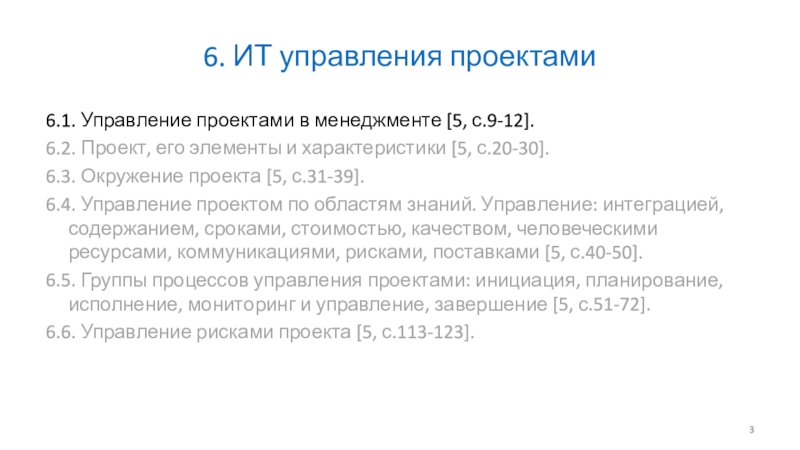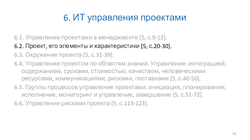 6.4. Управление проектом по областям знаний. Управление: интеграцией, содержанием, сроками, стоимостью, качеством, человеческими ресурсами, коммуникациями, рисками, поставками [5, с.40-50].