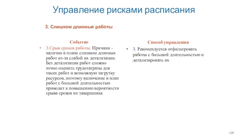 сложно точно оценить трудозатраты для таких работ и возможную загрузку ресурсов, поэтому включение в план работ с большой длительностью приводит к повышению вероятности срыва сроков их завершения.