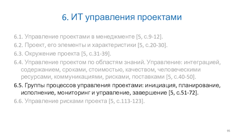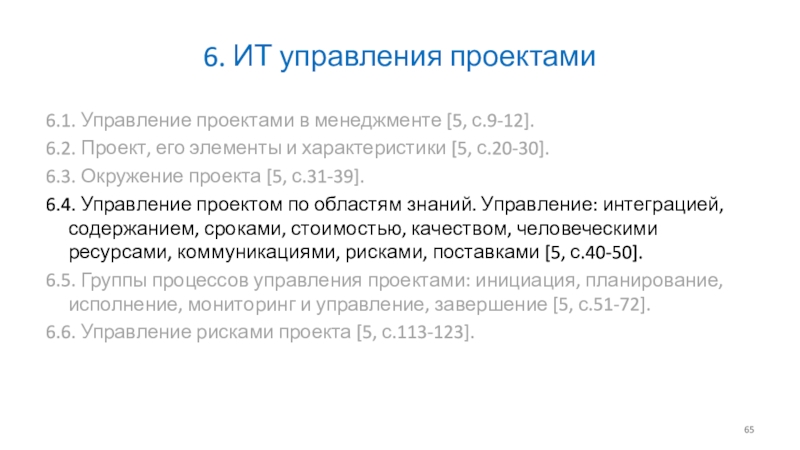 6.5. Группы процессов управления проектами: инициация, планирование, исполнение, мониторинг и управление, завершение [5, с.51-72].