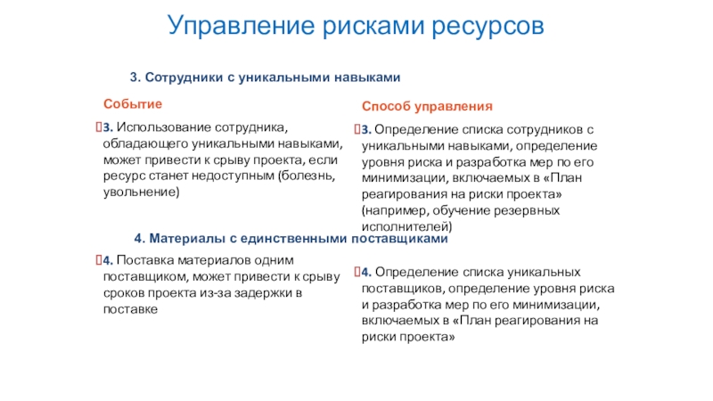 3. Определение списка сотрудников с уникальными навыками, определение уровня риска и разработка мер по его минимизации, включаемых в «План реагирования на риски проекта» (например, обучение резервных исполнителей)
