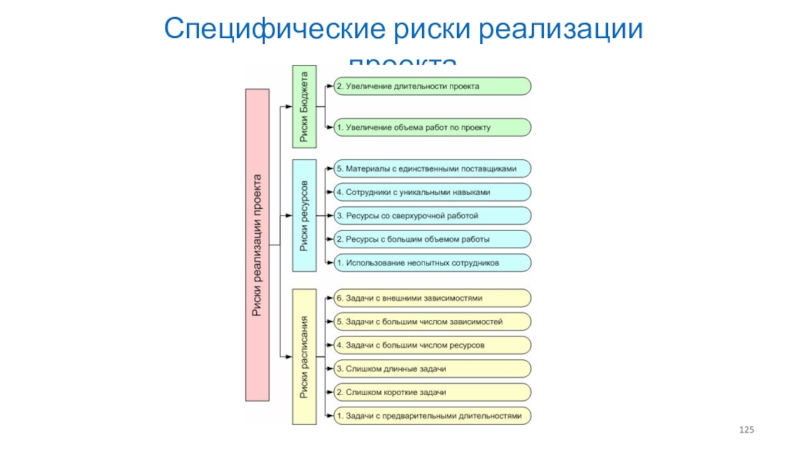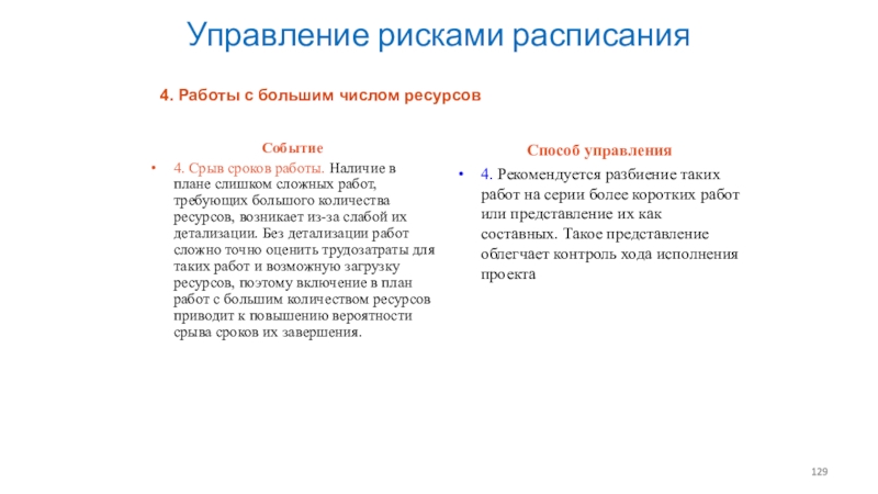 детализации. Без детализации работ сложно точно оценить трудозатраты для таких работ и возможную загрузку ресурсов, поэтому включение в план работ с большим количеством ресурсов приводит к повышению вероятности срыва сроков их завершения.