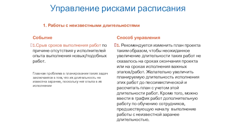 1. Рекомендуется изменить план проекта таким образом, чтобы неожиданное увеличение длительности таких работ не сказалось на сроках окончания проекта или на сроках исполнения важных этапов/работ. Желательно увеличить планируемую длительность исполнения этих работ до пессимистической и рассчитать план с учетом этой длительности работ. Кроме того, можно ввести в график работ дополнительную работу по обучению сотрудников, предшествующую началу выполнение работы с неизвестной заранее длительностью.