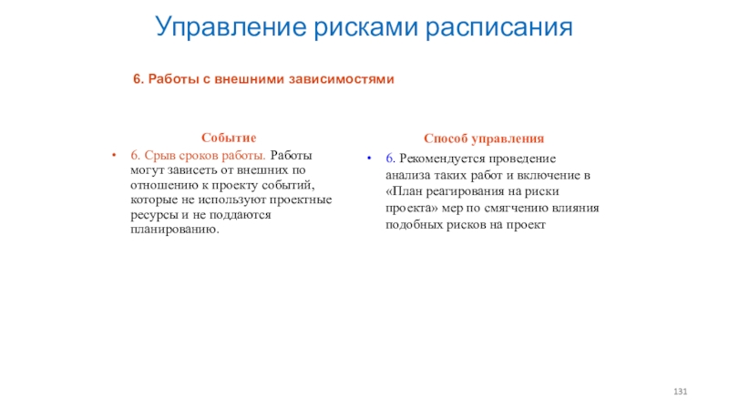 6. Рекомендуется проведение анализа таких работ и включение в «План реагирования на риски проекта» мер по смягчению влияния подобных рисков на проект