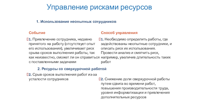 1. Необходимо определить работы, где задействованы неопытные сотрудники, и описать риск их использования. Провести анализ и смягчить риск, например, увеличив длительность таких работ