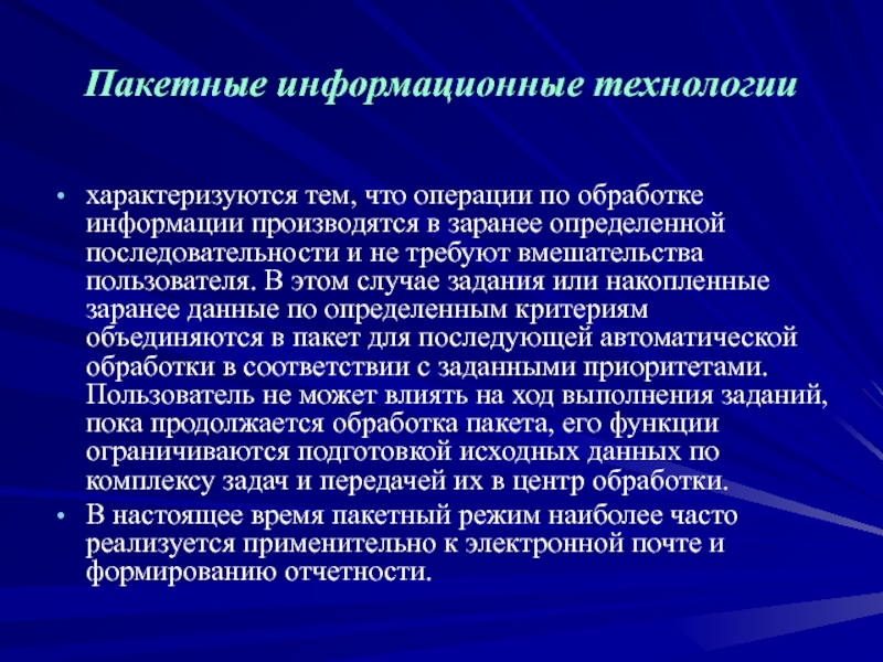 Эти технологии предусматривают наличие интегрированных пакетов прикладных программ: текстовый процессор, табличный процессор, электронная почта, телеконференции, специализированные программы реализации электронного документооборота и т. д.